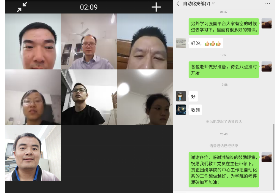 5月26日晚上8点,自动化支部7名教工党员准时进入微信群,通过微信视频的方式召开线上支部主题党日。会议开始,党支部书记王后能介绍了本次支部主题党日的主题,并邀请支部成员、院长洪汉玉传达学校相关会议精神。